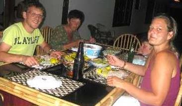 Sie sagen das Essen in der Villa Sunshine hat super geschmeckt und sie haben zu Hause auch schon was nachgekocht. Christine zeigt hier auch ganz Stolz ihren schönen braunen Arm, gereift im Sri Lanka Urlaub. Ist bestimmt so braun, weil er beim Tuktuk fahren immer draußen hing. hihi!