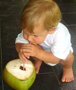 So ist es richtig der kleine Mann zieht einen ordentlich schluck aus der Nuss. Es soll schön machen und hilft gegen den Durst.