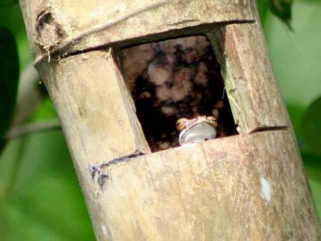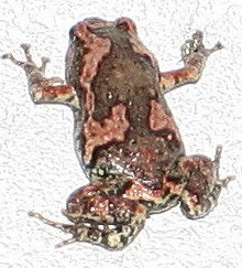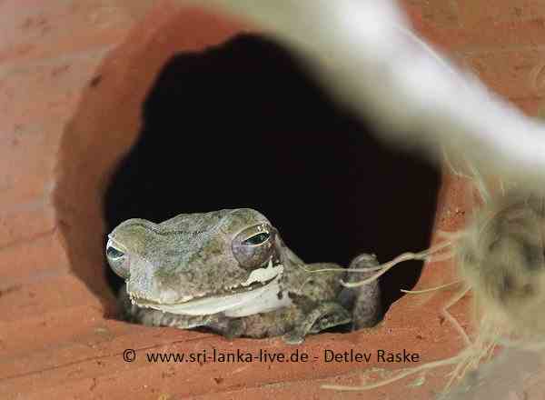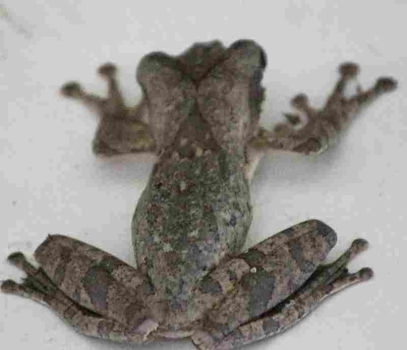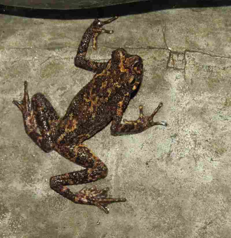 auf die Geräusche von überall her hören wir zirpen und zwitschern. pfeifen und sogar ein meckern - von Ziegen? Ein Käuzchen ruft es raschelt was, aber es ist dunkel und wir können nichts sehen. Es ist richtig laut solange wir uns auf die Geräusche konzentrieren, plötzlich zwitschert etwas direkt in unserer Nähe also schnell die Taschenlampe geholt und nachgesehen ein kleines Baumfröschchen ca. 2,5 cm groß. die Farben braun bis Kupfer mit teilweise winzigen weißen Sprenkeln. Gern würde ich mehr über diese Art wissen. Also werde ich versuchen mal etwas über diese Frösche zu finden. Wer für mich schon Infos hat kann sich gerne bei mir melden.