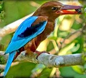 Aber wie ich gestehen muss, hat dieses Bild ein lieber Gast von uns geschossen. Sagt mal ehrlich sind das nicht super Farben, das Blau knallt richtig in den Augen. Hier sind nicht nur die Menschen schön bunt angezogen sondern auch die Vögel haben stark leuchtende Farben. Auf dem Bild hat der Braunkopfliest fette Beute gemacht, ein dicker Käfer hoffentlich ein Nashornkäfer(Schädling) den haut er jetzt ein paar mal gegen den Ast bis er nicht mehr zappelt und dann wird er verschluckt. Auch der Braunkopfliest Halcyon smyrnensis wird zu den fliegenden Edelsteinen gezählt.