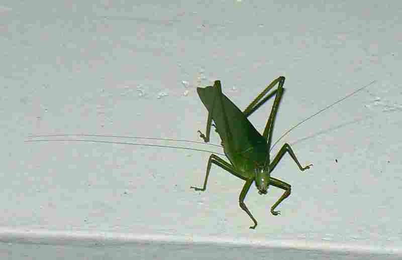 An der Wand sitzt ein Grashüpfer Heupferdchen an der Wand
