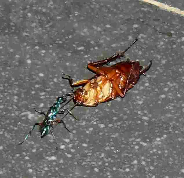 Danach lief die Schabe nicht mehr durch die Gegend wahrscheinlich hat nun das Gift der Juwelwespe die Schabe richtig gelähmt.