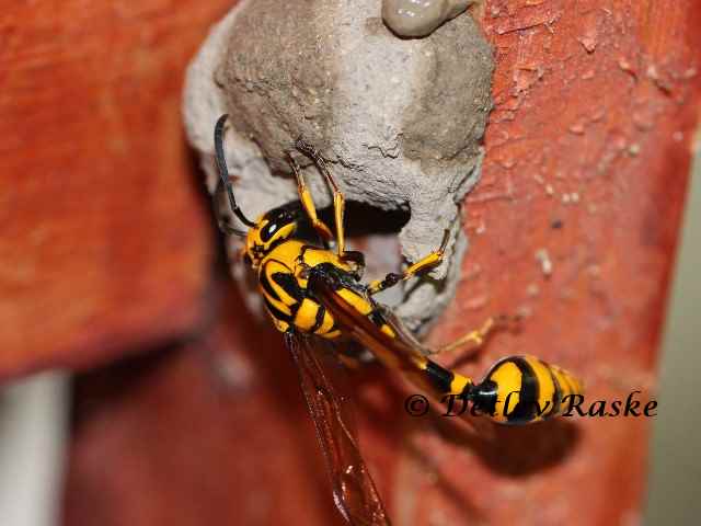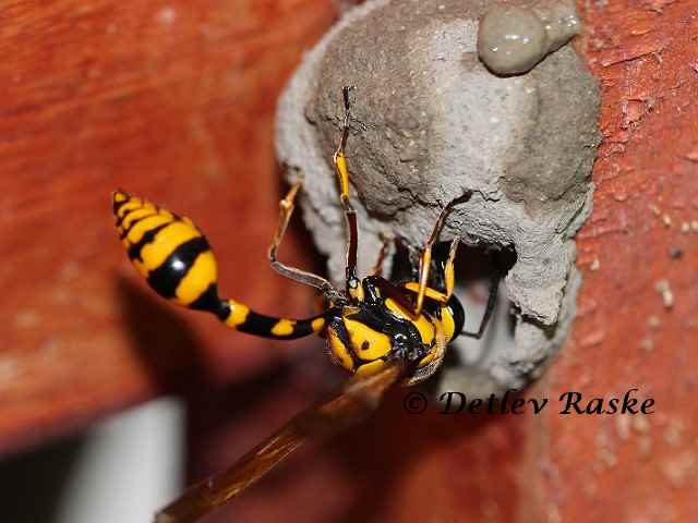 Die Schlamwespe ist circa 5cm lang. Sie nimmt regelmäßig Wasser auf und macht damit einen aus Lehmerde einen Schlamm aus dem sie die Brutkammer für ihren Nachwuchs baut. Genau gesagt sind es zwei Kammern in eine dient als Vorratskammer.
