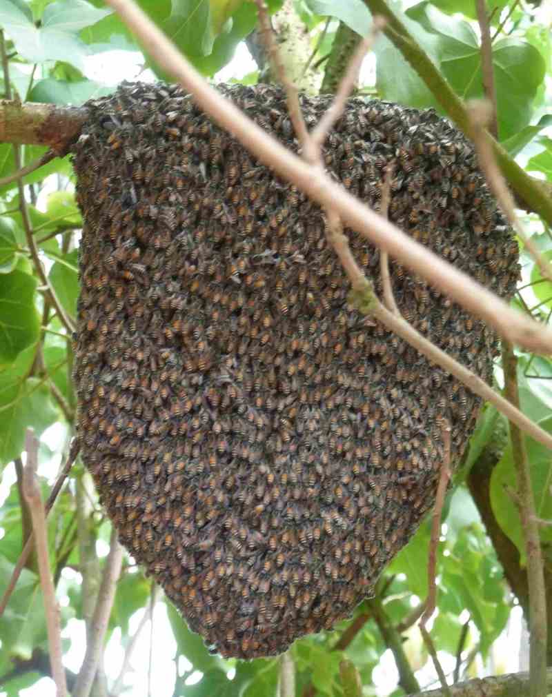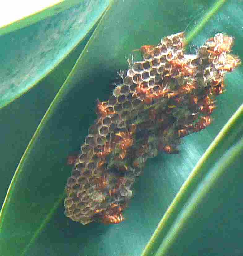 Also diese kleinen Wespen oder Bienen(Bild links) stechen gemein, es schmerzt ordentlich und Sie sollten so einem Nest nicht zu Nahe kommen. Gerne baut diese Art ihre Brutwabe unter größere Blätter von Pflanzen die ihre Blätter nicht schnell abwerfen. Auf dem Foto ist die Wabe an einem Gummibaumblatt.