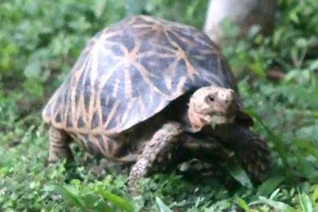 Es handelt es sich um die wohl schönste Landschildkrötenart - die Sternschildkröte - Geochelone elegans . Ausgewachsen hat sie eine Körperlänge von 26-32 cm, wobei Männchen auch ca. 22cm lang werden können. Eine gelbe strahlenförmige Zeichnung verläuft auf dem schwarzen Untergrund.