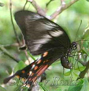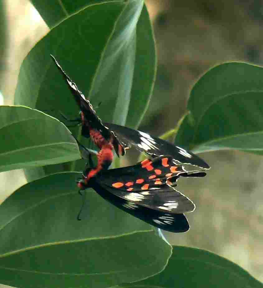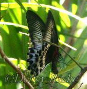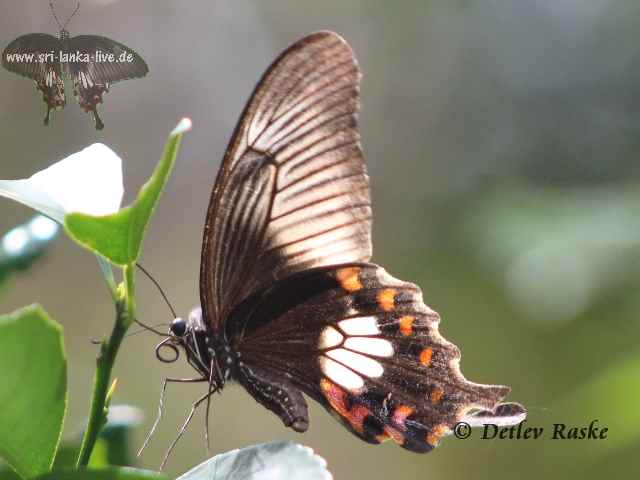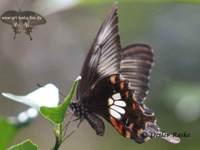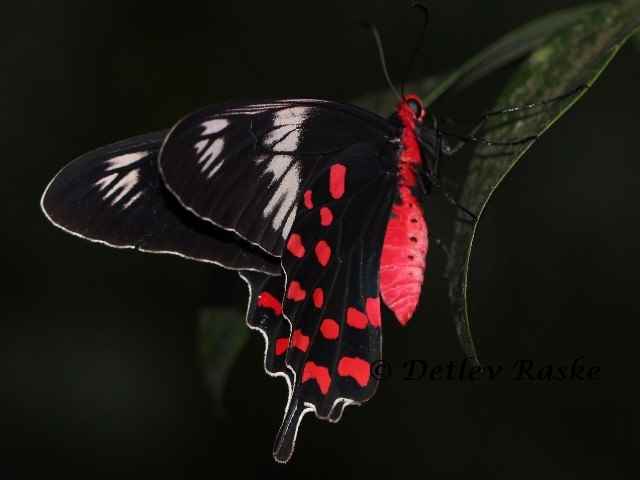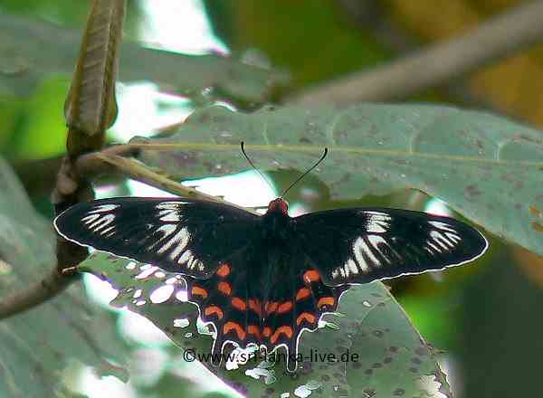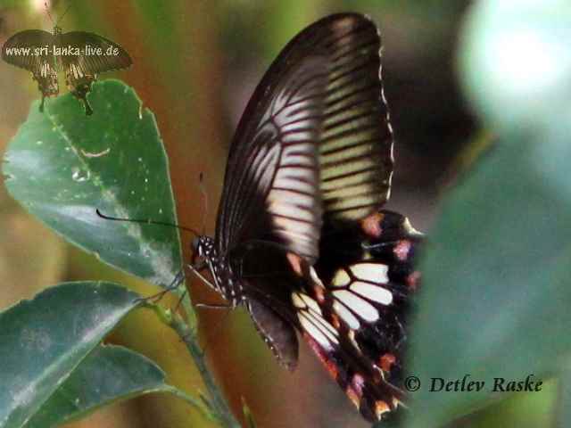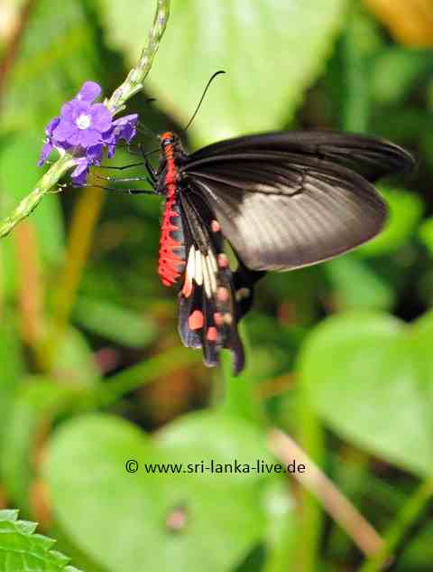 Pachliopta aristolochiae(Fotos- ein Weibchen) ist in Sri Lanka noch öfter mal zu sehen Pachliopta aristolochiae Deutscher Name: Gewöhnliche Rose Flügelspannweite ca. 9 - 10 cm. Der Falter Pachliopta aristolochiae hat eine schwarze Grundfärbung. mit weißer und roter Zeichnung, der Körper ist stellenweise rötlich bis rot Geschlechtsunterschiede bei dieser Art sind sehr deutlich. Das Männchen ist kleiner und viel unscheinbarer und lange nicht so gefärbt als das Weibchen.