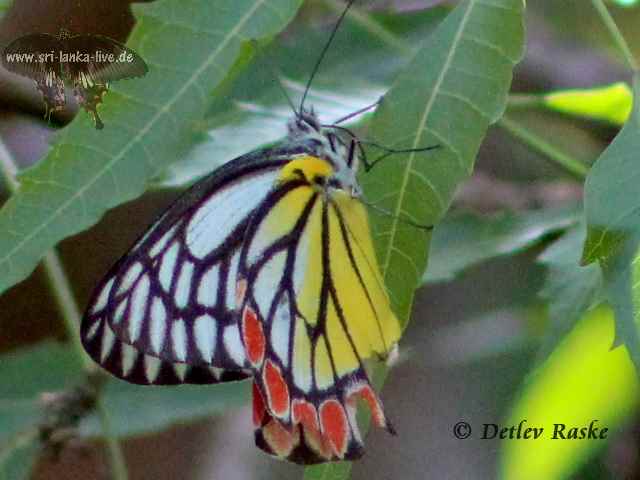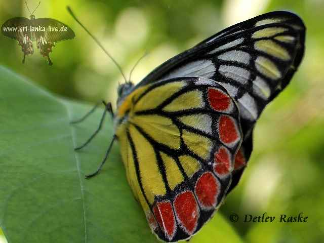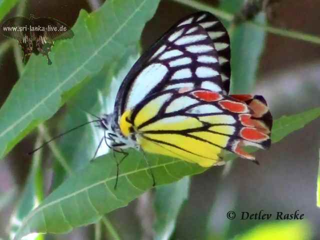 Delias eucharis Der Gemeine Jezebel oder auch bunter Jezebel(Delias eucharis) ist ein mittelgroßer Schmetterling und gehört zu der Familie der Weißlinge (Pieridae). Mit ca. 8 cm Flügelspannweite, der in vielen Gegenden Asiens vorkommt zum Beispiel in Sri Lanka, Indien, Nord-Myanmar, Thailand, Indonesien. In Sri Lanka haben wir in bei uns im Garten in Ahangama entdecken können. Die zum Teil grellen wunderschönen Farben lassen vermuten das der Falter ungenießbar ist. Kein Vogel zeigte Interesse an ihm. Er fliegt in der Regel hoch über den Bäumen zur Futteraufnahme kommt er auch in Bodennähe.